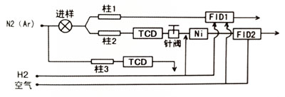 樣品氣通過一路載氣進(jìn)入FID1檢測(cè)器檢測(cè)出烴類氣體,通過另一路載氣先進(jìn)入TCD檢測(cè)器檢測(cè)H2、O2;然后經(jīng)鎳轉(zhuǎn)化爐,進(jìn)入FID2檢測(cè)器檢測(cè)出CO、CO2,克服大量CO、CO2對(duì)烴類氣體,尤其是對(duì)C2H2的檢測(cè)干擾,大大提高了烴類氣體的檢測(cè)靈敏度;